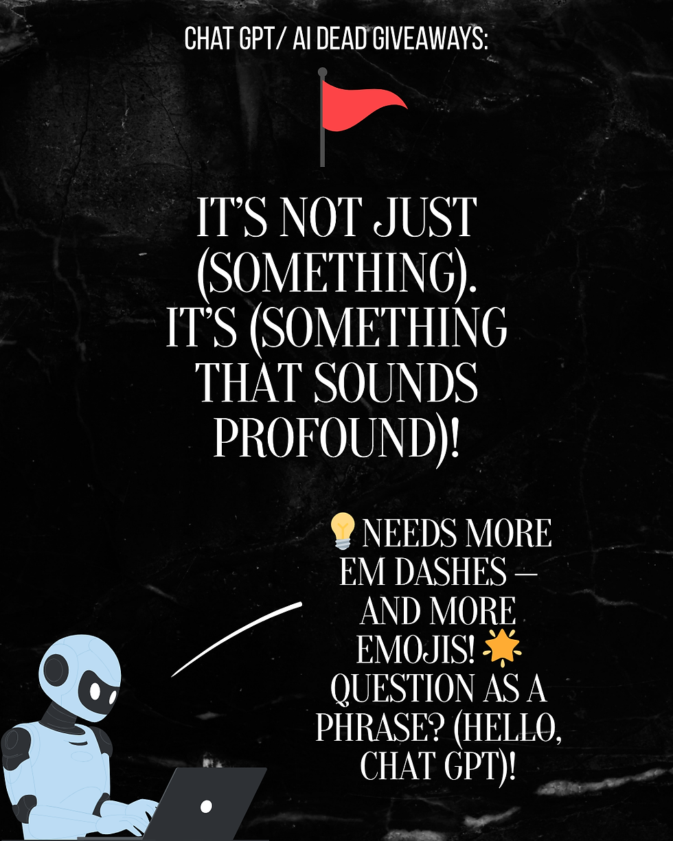 But if I call them out for just using Chat GPT for content, I look like a jerk. So I either ignore and scroll or correct some misinformation in a follow up comment that doesn’t get seen.